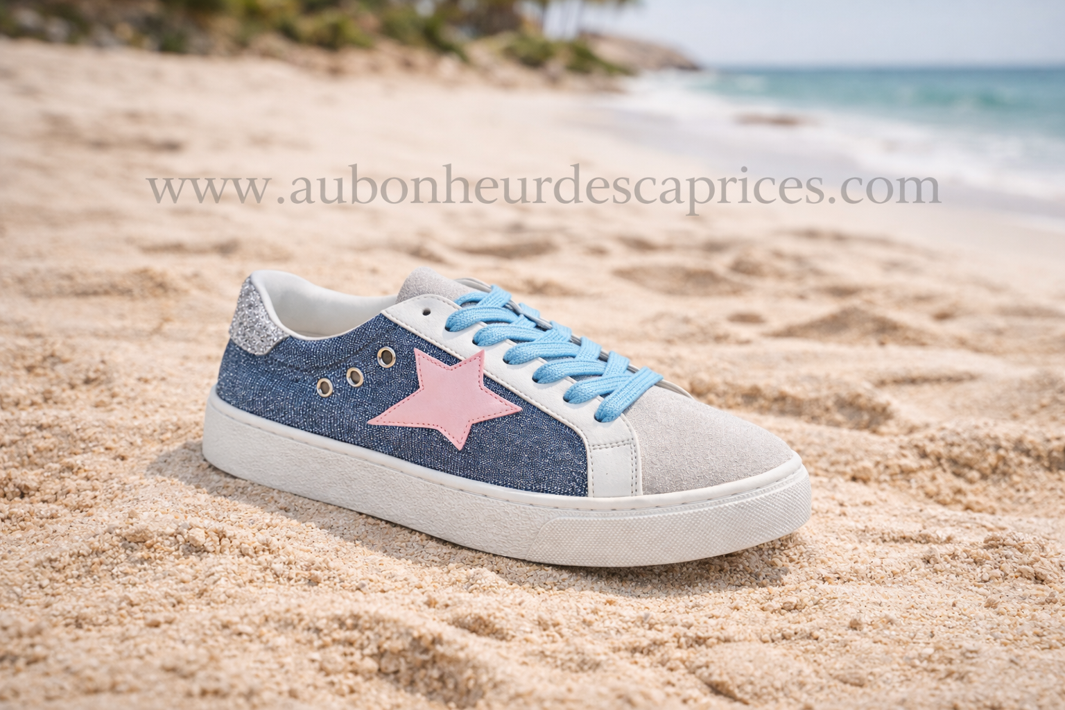 Basket étoile Findlay bleu pailletée avec étoile rose. Sneaker femme confortable et tendance, parfaite pour un look casual chic au quotidien.– L’élégance casual chic au style lumineux