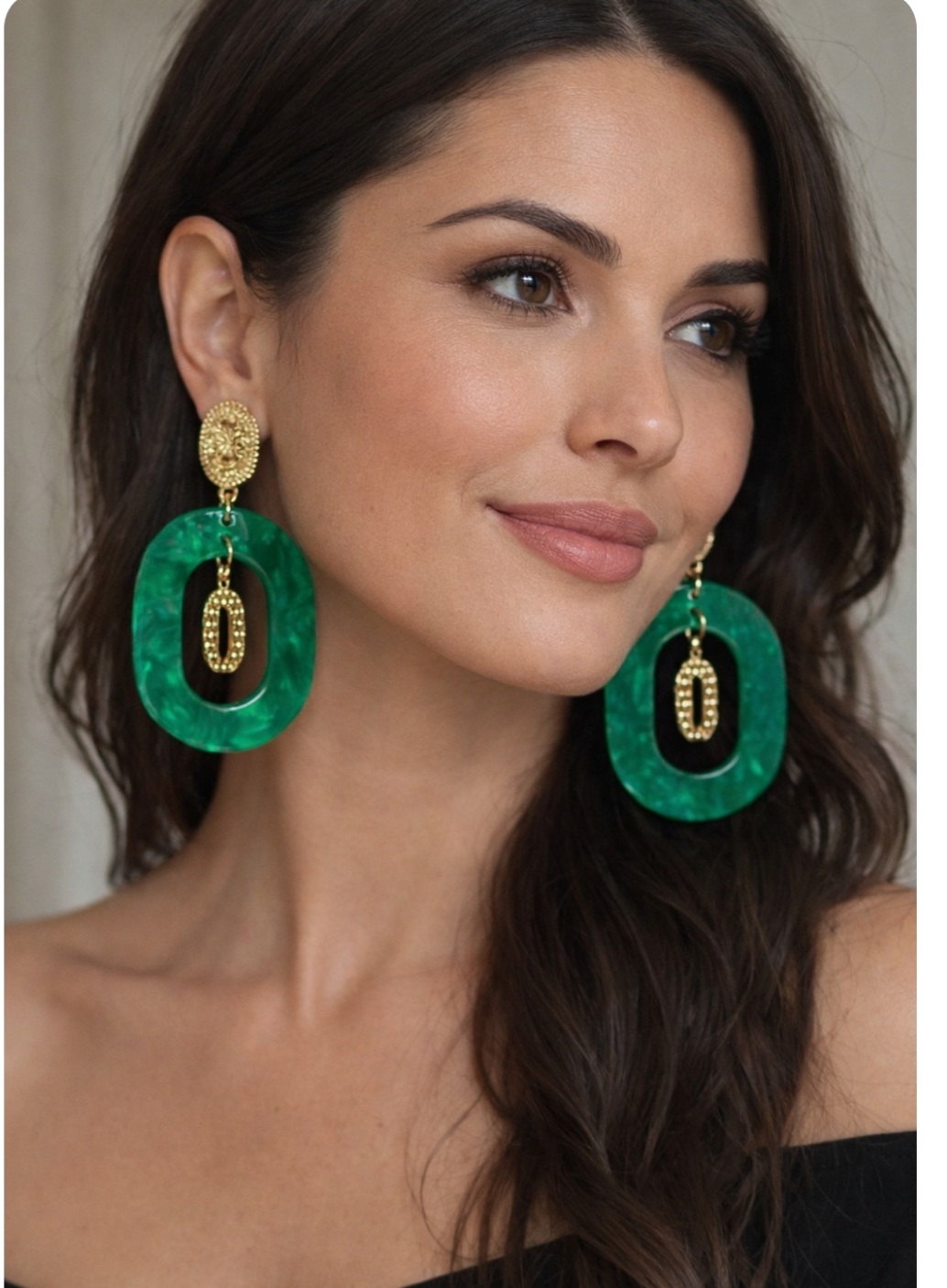 La boucle d’oreille ovale vert et or est particulièrement appréciée pour sa polyvalence. Elle convient à toutes les carnations et met en valeur aussi bien les cheveux clairs que foncés. Portée avec les cheveux relevés, elle devient un véritable bijou. Avec les cheveux lâchés, elle apporte une touche de couleur élégante qui se dévoile au gré des mouvements.