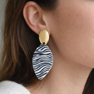 La partie inférieure est une goutte allongée, aux contours doux et légèrement arrondis, qui allonge visuellement la silhouette et met en valeur le port de tête. Elle est décorée d’un motif zébré graphique, composé de lignes ondulées irrégulières bleu marine et blanc. Ce motif, à la fois dynamique et élégant, évoque un esprit animal revisité de manière moderne et stylisée, sans excès.