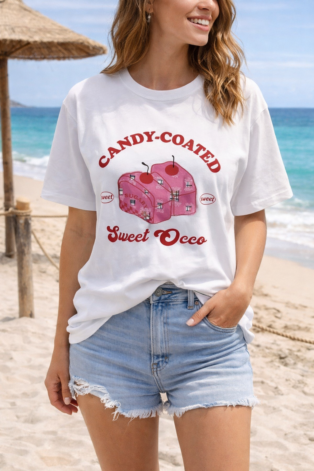 Apportez une touche gourmande et ultra tendance à votre dressing avec ce tee-shirt Candy femme blanc au design sucré irrésistible. À la fois fun, moderne et facile à porter, ce tee-shirt femme imprimé est la pièce parfaite pour dynamiser vos looks casual et streetwear. Son visuel “Candy-Coated – Sweet Deco” aux couleurs rose et rouge apporte une note pop et féminine qui attire immédiatement le regard.